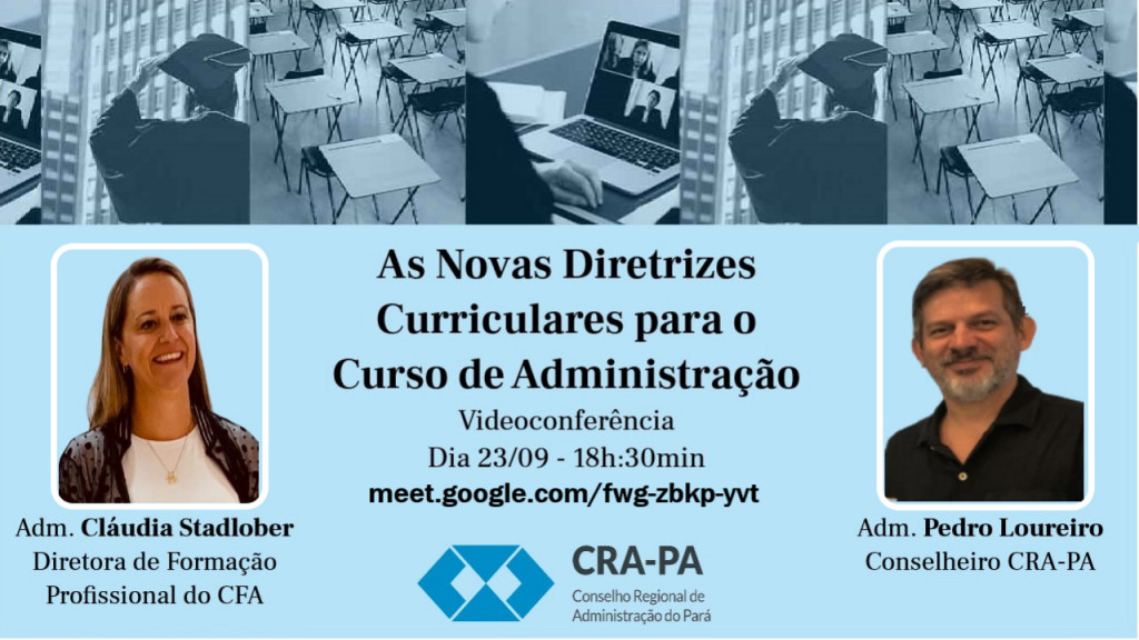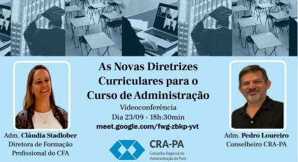 Nesta quarta-feira (23/09), com início às 18h:30min, as novas Diretrizes Curriculares (DCNs) para os cursos de Bacharelado em Administração é o tema da videoconferência promovida pelo CRA-PA que será apresentada pela coordenadora da Comissão Especial de Análise das DCN dos Cursos de Administração e diretora da Câmara de Formação Profissional do CFA, Adm. Cláudia Stadtlober, com a participação do conselheiro do CRA-PA, Adm. Pedro Refkalefsky Loureiro.