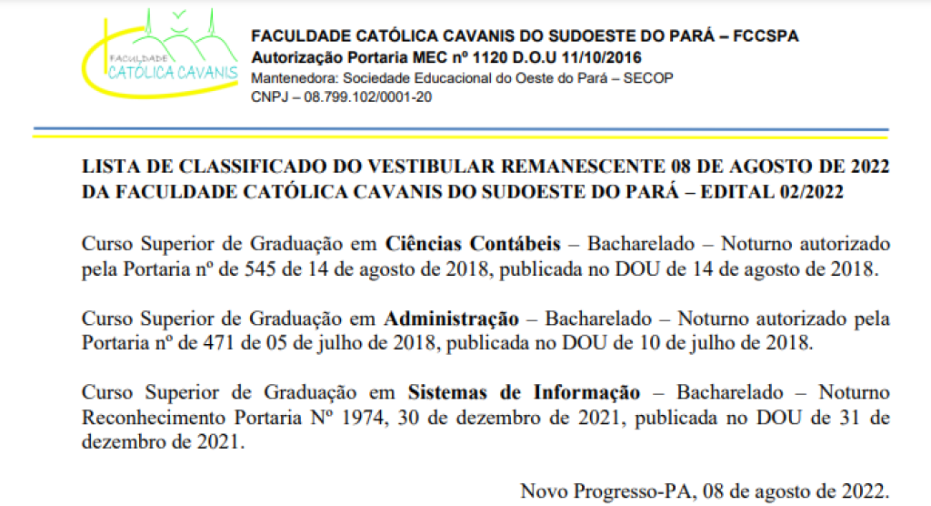 Curso Superior de Graduação em Ciências Contábeis – Bacharelado – Noturno autorizado pela Portaria nº de 545 de 14 de agosto de 2018, publicada no DOU de 14 de agosto de 2018. Curso Superior de Graduação em Administração – Bacharelado – Noturno autorizado pela Portaria nº de 471 de 05 de julho de 2018, publicada no DOU de 10 de julho de 2018. Curso Superior de Graduação em Sistemas de Informação – Bacharelado – Noturno Reconhecimento Portaria Nº 1974, 30 de dezembro de 2021, publicada no DOU de 31 de dezembro de 2021. Novo Progresso-PA, 08 de agosto de 2022.